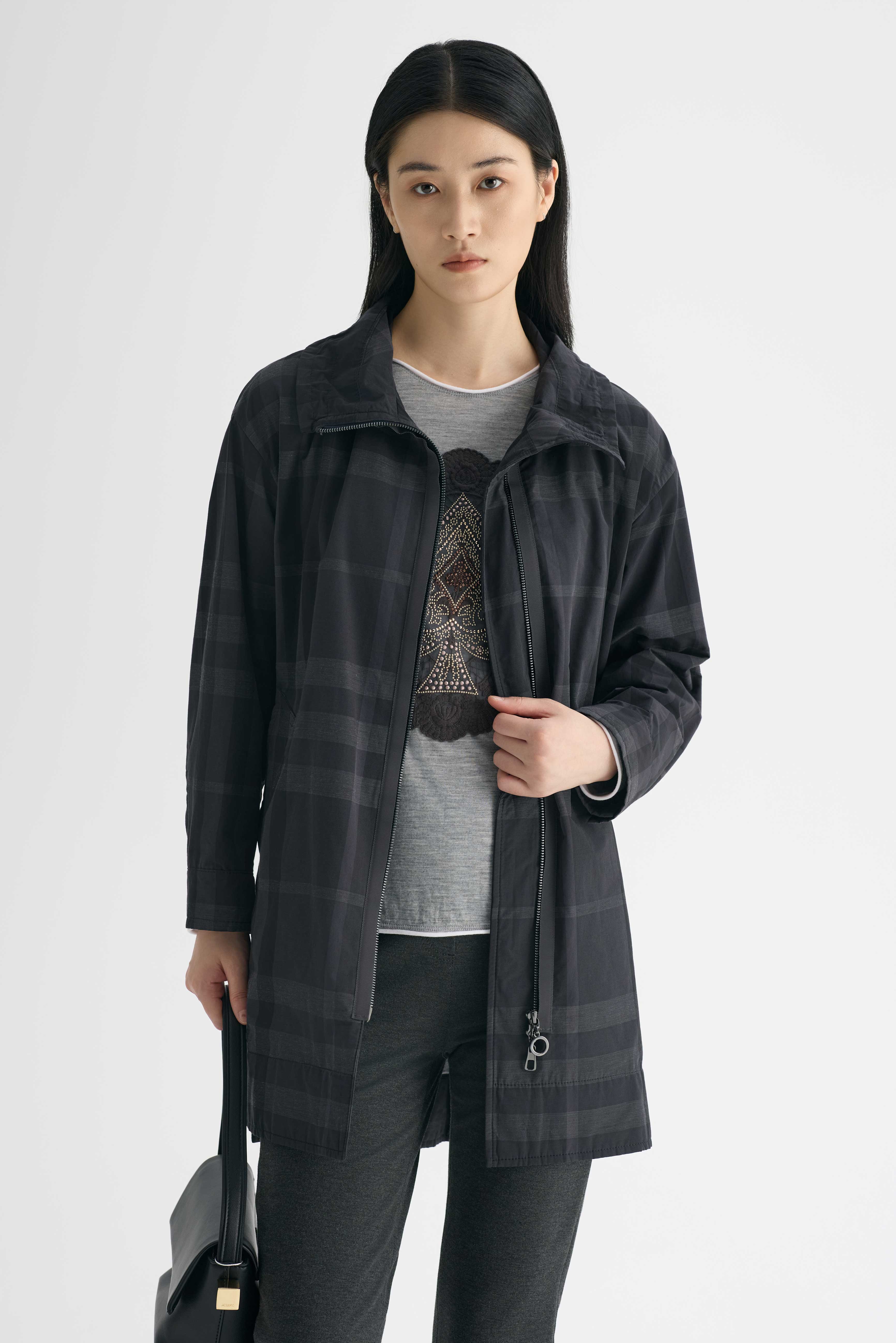 碳素灰窗棱格女风衣